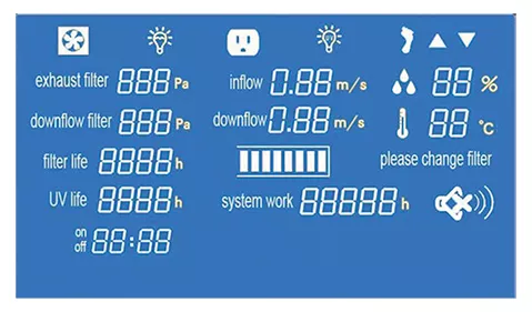 | Visual and Audio Alarm | Filter replacement, window over height, abnormal air flow velocity, High filter pressure alarm |