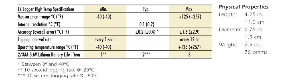 stores up to 32,510 temperature readings over the -40ºC to +125ºC (-40ºF to +257ºF) measurement